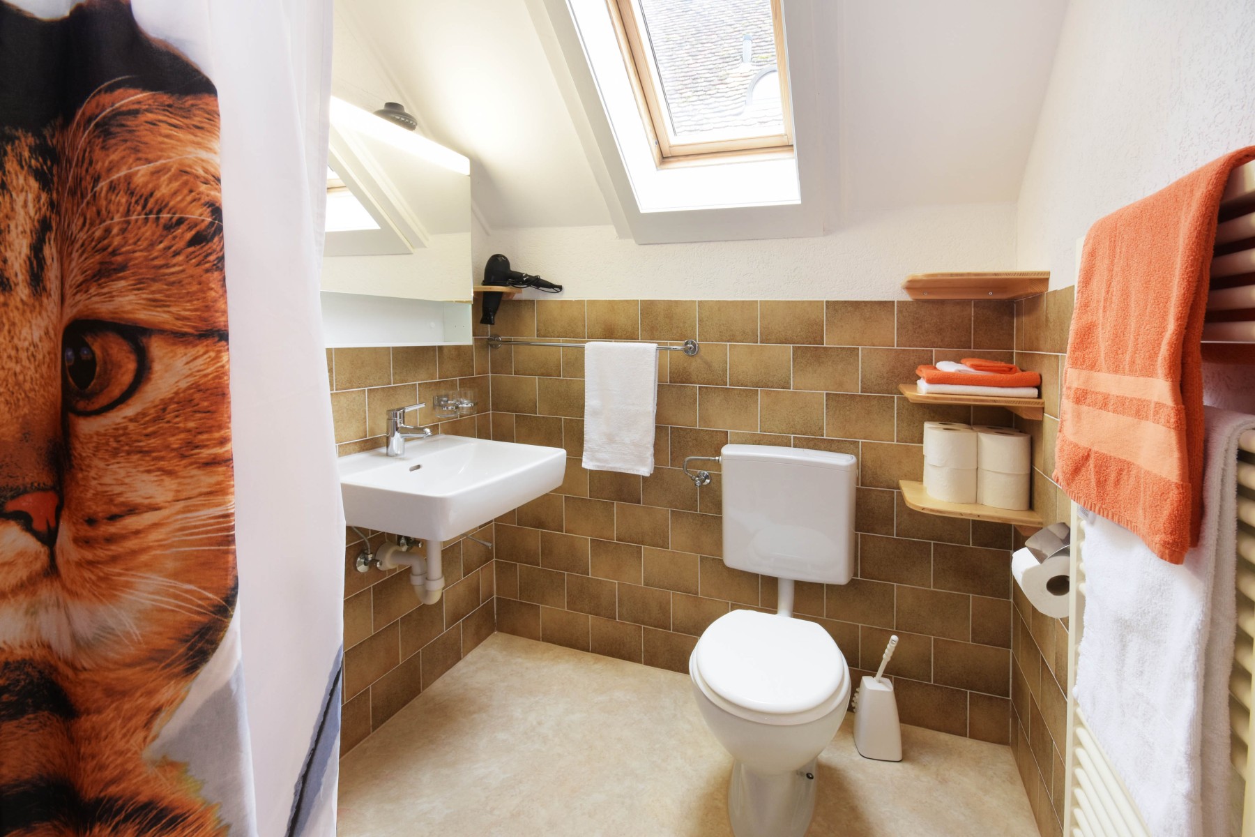 Dusche, WC, Waschbecken, Dachfenster