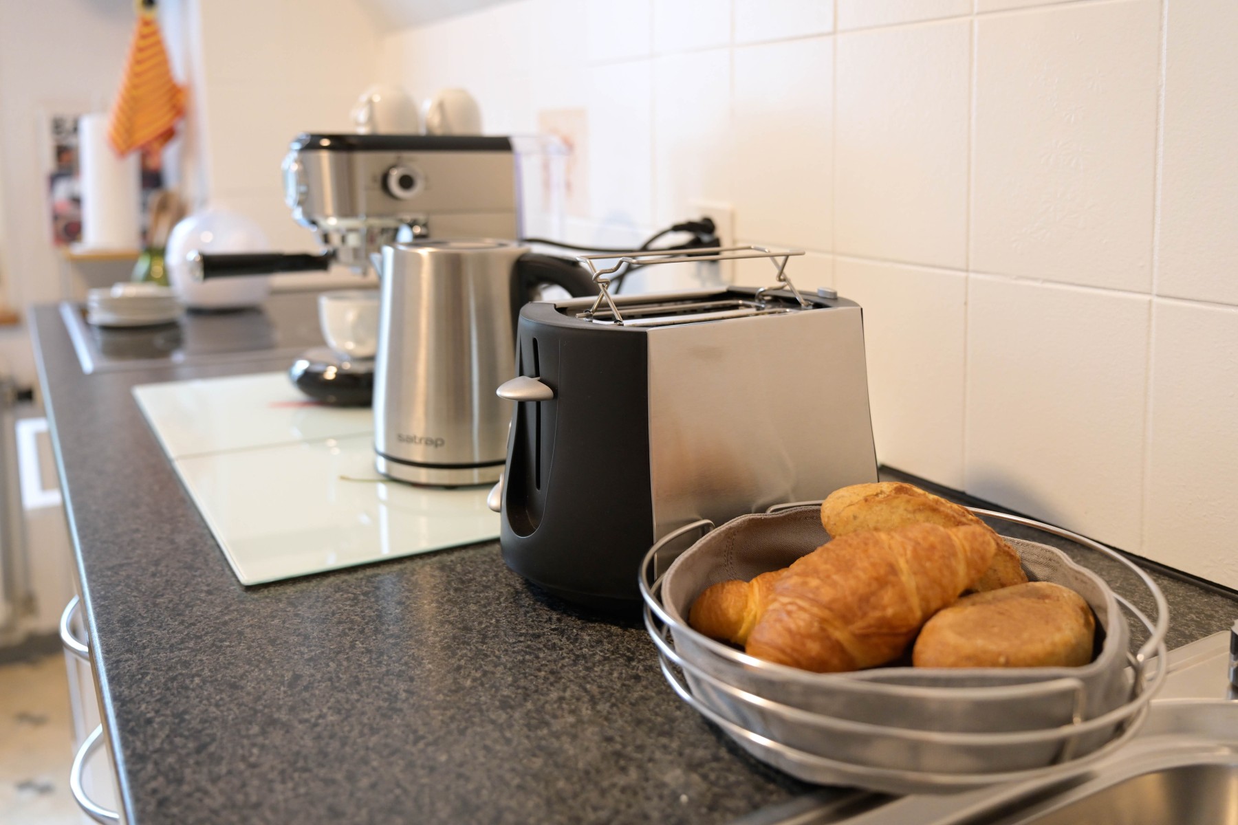 Glaskeramikkochfeld, Umluft Backofen, Geschirrspüler (inkl. Taps), Kaffeemaschine (geeignet für Kaffeepulver) mit Milchwärmer, Wasserkocher, Toaster, Eierkocher, Mixer.