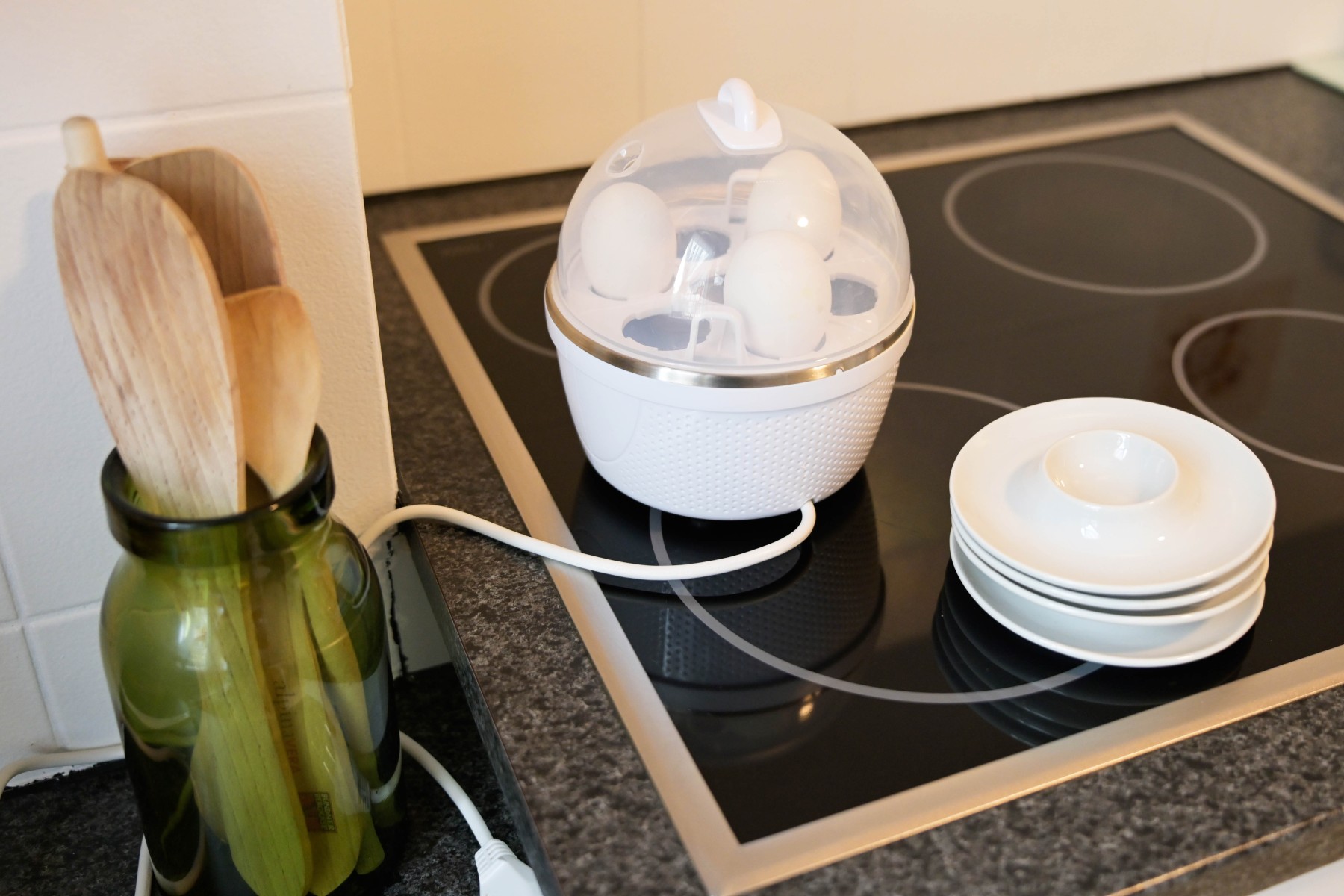 Glaskeramikkochfeld, Umluft Backofen, Geschirrspüler (inkl. Taps), Kaffeemaschine (geeignet für Kaffeepulver) mit Milchwärmer, Wasserkocher, Toaster, Eierkocher, Mixer.