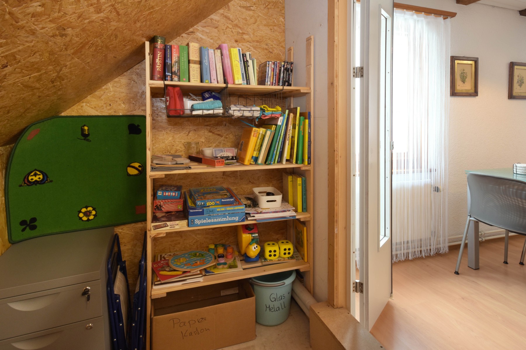Freizeitregal; Notfallset, Bücher, DVDs, Spielsachen und altersgerechte Spiele, Farbstifte.