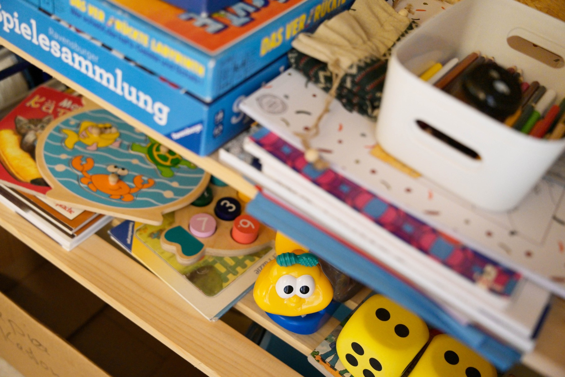 Freizeitregal; Notfallset, Bücher, DVDs, Spielsachen und altersgerechte Spiele, Farbstifte.