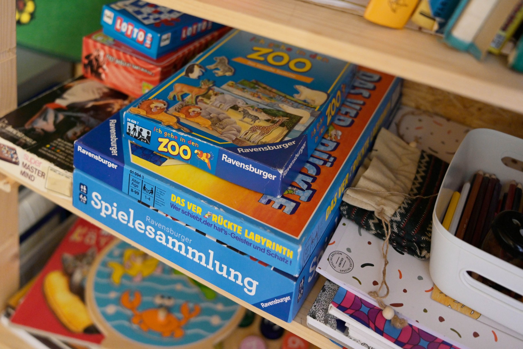 Freizeitregal; Notfallset, Bücher, DVDs, Spielsachen und altersgerechte Spiele, Farbstifte.